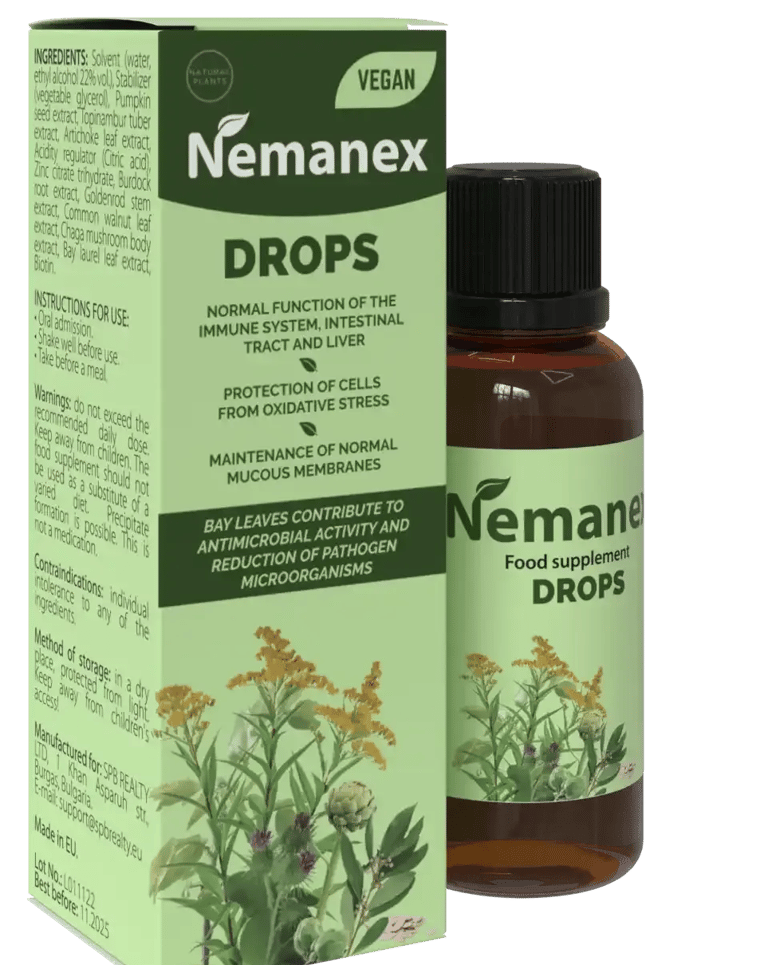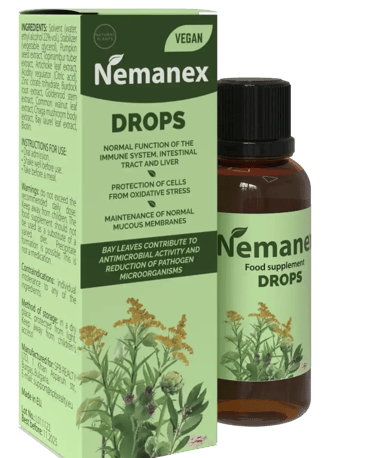 Nemanex est un complément alimentaire sous forme de gouttes, généralement commercialisé en flacons de 30 ml. Il est présenté comme un produit favorisant la détoxification de l'organisme et le soutien du système immunitaire. Sa formule, décrite comme à base d'extraits naturels, a pour objectif d'aider l'organisme à lutter contre les parasites et les toxines